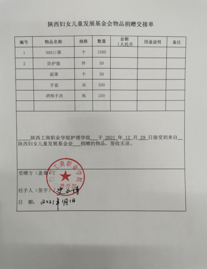 2021年12月29日,西安康泰健康医疗有限公司积极联系对接陕西省妇女儿童基金会,在基金会的大力支持下,联合一起为陕西开放大学、陕西工商职业学院送去N95口罩1500个、防护服50件、面罩50个、手套500双、酒精手消200瓶。
