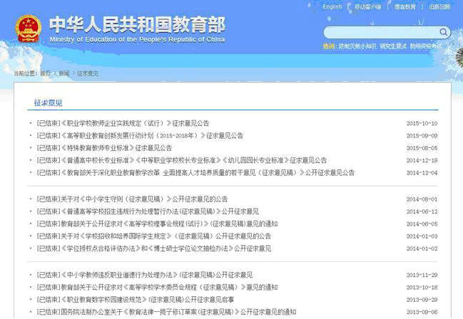 2.推动决策过程公开。制定的《特殊教育教师专业标准》《高等职业教育创新发展行动计划(2015-2018年)》《职业学校教师企业实践规定(试行)》等3项重要规范性文件草案均在门户网站征求意见专栏向全社会公开征求意见,其中2项在广泛听取了社会各方意见建议并修改完善后正式发布。在编制起草《普通高等学校高等职业教育(专科)专业设置管理办法》《教育部重点实验室建设与运行管理办法》《中小学生艺术素质测评办法》等重要文件时,广泛听取了社会各方意见建议。在门户网站征集教育“十三五”规划建议建言,加强公众参与。