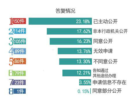 2.答复情况。647件申请已全部按时答复申请人,其中“已主动公开”的150件,占23.18%;“同意公开”的105件,占16.23%;“同意部分公开”的1件,占0.15%;“不同意公开”的86件,占13.30%;“不属于本行政机关公开”的114件,占17.62%;“申请信息不存在”的23件,占3.55%;“告知通过其他途径办理”的79件,占12.21%,无效申请89件,占13.76%)。