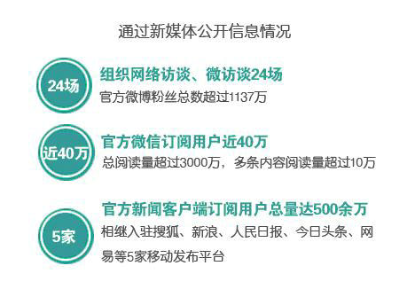 5.通过新媒体公开信息情况。加强新媒体运用和媒体联动,探索官方微博、微信、新闻客户端及门户网站、教育报、教育台联动的新闻发布模式,做好新闻发布、热点回应、信息服务等工作。组织网络访谈、微访谈24场;官方微博粉丝总数超过1137万;官方微信订阅用户近40万,总阅读量超过3000万,多条内容阅读量超过10万;官方新闻客户端已相继入驻搜狐、新浪、人民日报、今日头条、网易等5家移动发布平台,订阅用户总量达500余万。