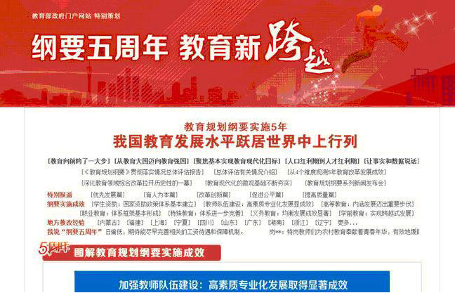 3.推进执行情况和执行结果公开。一是公开教育规划纲要落实情况。在网站开设专题专栏,整合媒体报道、专家观点、采访调研、群众声音等内容,系统公开推动协调发展、推进改革开放、提高教育质量、促进教育公平等方面改革发展进展和成果。召开8次教育规划纲要实施5周年系列新闻发布会,分专题向社会介绍5年来纲要实施成效。二是公开重点工作进展。在门户网站开设专题,公开“深化高等学校创新创业教育改革”“推进世界一流大学和一流学科建设”“乡村教师支持计划”“全面实施教育扶贫全覆盖行动”“首届中国‘互联网+’大学生创新创业大赛”“职业院校管理水平提升行动计划”“首届全国中小学生电影周”等重点工作和重大项目进展。三是公布重点工作结果。公布2015年全国高等学校名单,国家级大学生创新创业训练计划项目名单,全国青少年校园足球特色学校及试点县(区)遴选名单等,方便社会公众知晓。公开“长江学者奖励计划”等重大人才项目情况,对教育部评选的全国教育系统先进集体和先进个人以及推荐的“全国杰出专业技术人才”“百千万人才工程”等人选进行公示,接受社会监督。