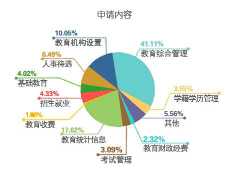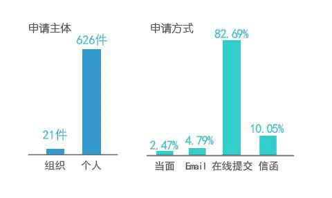 1.申请情况。1月1日至12月31日,共收到公民、法人和其他组织通过各种形式提出的信息公开申请647件,较2014年的281件增长了130%。从申请的主体看,公民个人提出的申请626件、其他组织提出的申请21件。从申请方式看,当面申请16件,占2.47%;以电子邮件方式申请31件,占4.79%;以纸质信函方式申请65件,占10.05%;以在线提交方式申请535件,占82.69%。涉及教育综合管理的266件,占41.11%;涉及教育统计信息的114件,占17.62%;涉及教育机构设置的65件,占10.05%;涉及人事待遇的42件,占6.49%;涉及招生就业的28件,占4.33%;涉及基础教育的26件,占4.02%;涉及学籍学历管理的23件,占3.55%;涉及考试管理的20件,占3.09%;涉及教育财政经费的15件,占2.32%;涉及教育收费的12件,占1.86%;其他36件,占5.56%。申请内容涉及教育部20个业务司局。