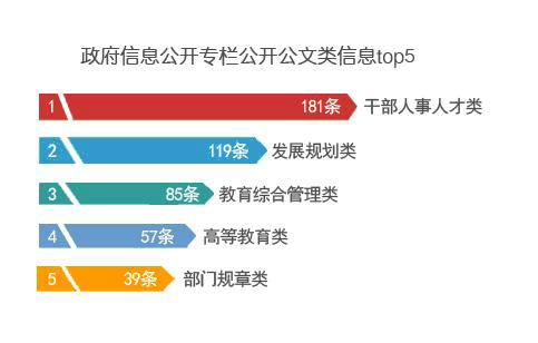 1.通过公开专栏公开信息情况。通过政府信息公开专栏公开公文类信息共计507条,教育部政策公文中非涉密普发下行文78%做到了主动公开。其中位于前5位的信息是:干部人事人才类181条,占比35.70%;发展规划类119条,占比23.47%;教育综合管理类85条,占比16.77%;高等教育类57条,占比11.24%;部门规章类39条,占比7.69%;其他26条,占比5.13%。