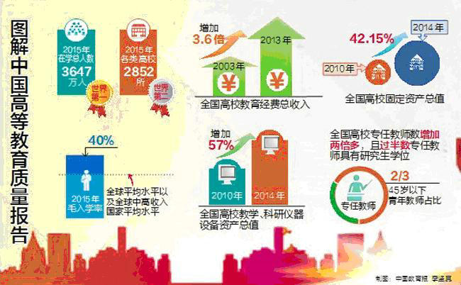 数据显示,中国高等教育“体量”世界最大,人才培养为各行各业提供了强有力的基础支撑。新世纪以来,中国高等教育实现跨越式发展,2015年在学总规模3647万人(其中普通高校本专科2625万人),位居世界第一;各类高校2852所,位居世界第二;毛入学率40%,高于全球平均水平及全球中高收入国家平均水平。高等教育发展与国民经济发展基本同步,并适度超前。2000年以来,为适应地方经济发展,中国主动调整高等教育布局结构,与区域经济社会发展步调保持协调。新建院校助推中国高等教育大转型,体现了新时期我国高等教育分类发展、分类指导的思想。按照教育规划纲要提出的创新型、复合型、应用型、技能型人才培养要求,中国高校各安其位、各显其能、特色发展,扭转了以往“千校一面”的状况。