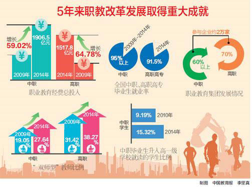 报告指出,5年来我国加快推进现代职教体系建设,完成现代职业教育体系顶层设计,实现不同层次职业教育的相互衔接,并且促进了终身教育体系建设。2014年高职分类考试招生151万名,占高职招生人数的45%。职业院校和社会力量办学开展多种形式的职业培训,每年举办政府补贴性培训2000万人次。