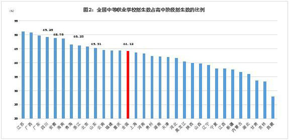 2014年,全国中等职业学校招生628.85万人,占高中阶段招生数的44.12%。江苏、广西、广东等10省市的这一比例超过45%(见图2)。