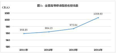 2014年,全国高等职业院校1327所,招生337.98万人,占普通本专科院校招生总数的46.9%,比2013年增长5.8%,是“十二五”以来增长最快的一年。高等职业院校在校生1006.6万人(见图1)。高等职业教育已占整个高等教育规模的40%。