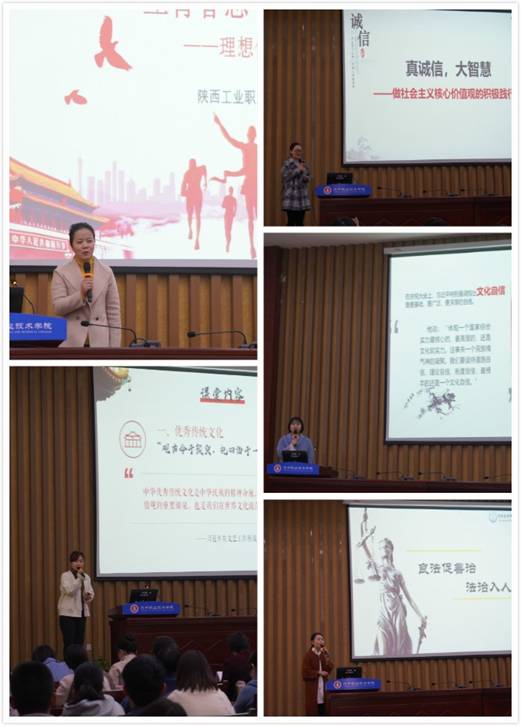 活动邀请了陕西省思政课教师“大练兵”主题活动中获奖的5名教学标兵进行课堂示范与经验交流。陕西工业职业技术学院董娟为大家带来《立青春志做追梦人—理想信念的重要性》示范教学,和《用案例教学点亮思政课堂》经验交流;陕西交通职业技术学院赵其勉作《文化显自信,底气助前行》示范教学,和《一个故事一课堂》经验交流;陕西职业技术学院陆訸作《真诚信,大智慧—做社会主义核心价值观的积极践行者》示范教学,和《以小见大,以点及面—用问题引导教学》经验交流;西安航空职业技术学院彭艳为大家带来《做文化自信的践行者》示范教学,和《春风化雨,润物无声—对如何做一名优秀思政课教师的思考》经验交流;陕西交通职业技术学院王真真作《良法促善治,法治入人心》示范教学,和《站在学生的角度备好思政课》经验交流。5名标兵的精彩展示赢得了在场参会人员的高度赞誉。