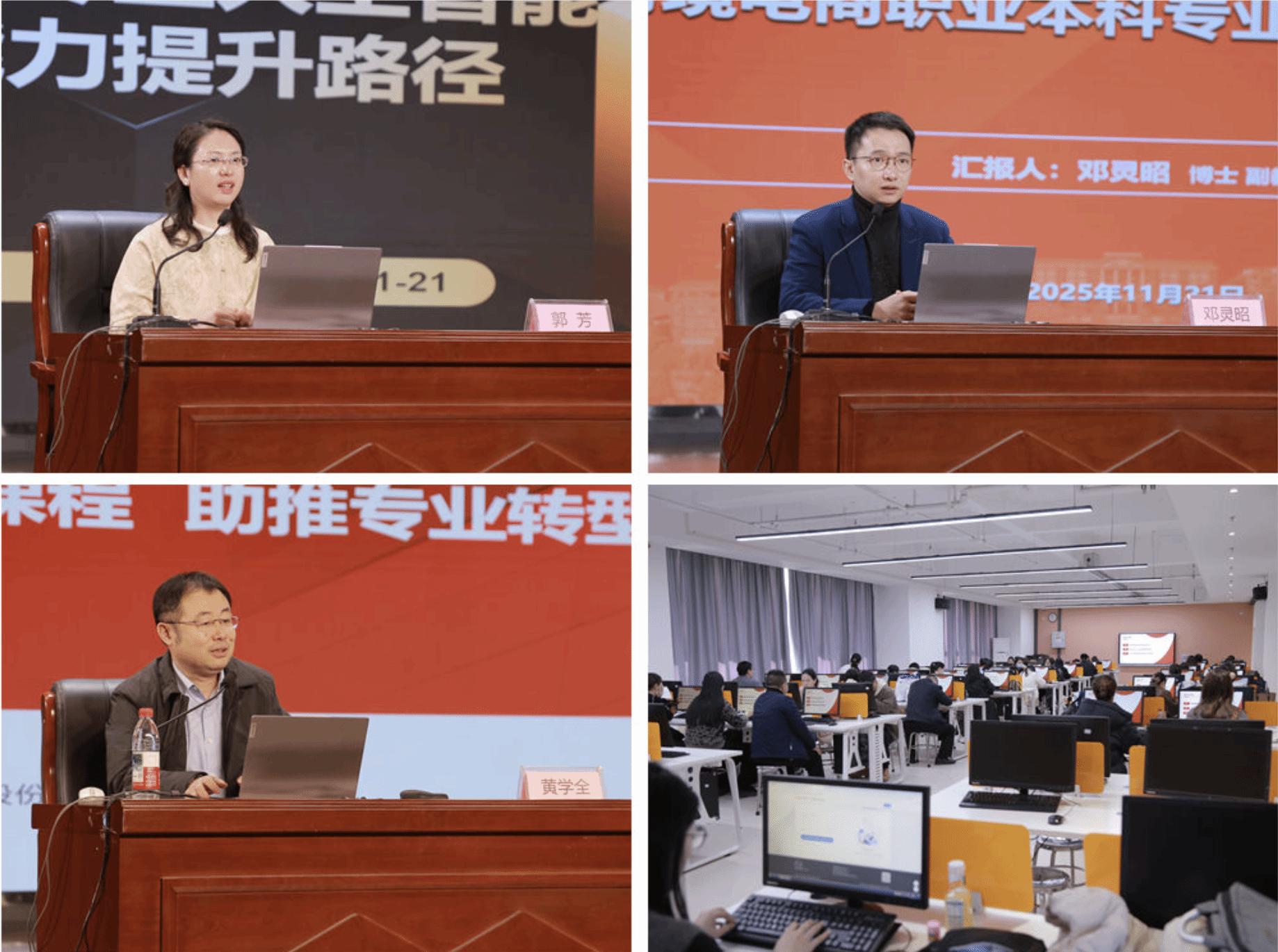 会议第一阶段,天津商务职业学院营销学院副院长郭芳博士、深圳职业技术大学跨境电商系主任邓灵昭博士、中国商业联合会副会长、北京中教畅享有限公司董事长黄学全分别从“商贸流通类专业人工智能+通用能力的培养方式”“跨境电商职业本科专业建设路径”“AI技术融入课程体系的路径”等角度,分享了人工智能与专业建设融合的经验,为与会者提供了宝贵的借鉴。