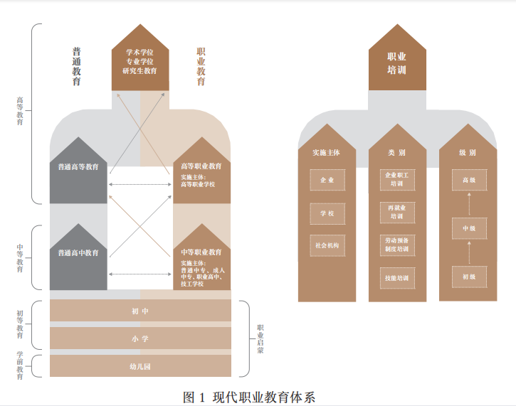 近年来,中国职业教育主动适应经济社会发展需要,落实职业学校教育和职业培训并重,促进职业教育与普通教育横向融通,推进不同层次职业教育纵向贯通,加快建设服务全民终身学习的现代职业教育体系(图1)。职业学校教育包括职业启蒙教育、中等职业学校教育、高等职业学校教育等阶段。职业培训包括技能培训、劳动预备制培训、再就业培训和企业职工培训等类别,依据职业技能标准,培训分为初级、中级、高级职业培训和其他适应性培训,企业、学校、社会机构等均可开展职业培训。