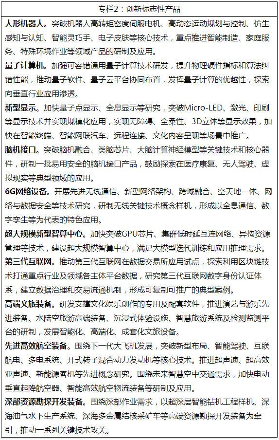 6.做强未来高端装备。面向国家重大战略需求和人民美好生活需要,加快实施重大技术装备攻关工程,突破人形机器人、量子计算机、超高速列车、下一代大飞机、绿色智能船舶、无人船艇等高端装备产品,以整机带动新技术产业化落地,打造全球领先的高端装备体系。深入实施产业基础再造工程,补齐基础元器件、基础零部件、基础材料、基础工艺和基础软件等短板,夯实未来产业发展根基。