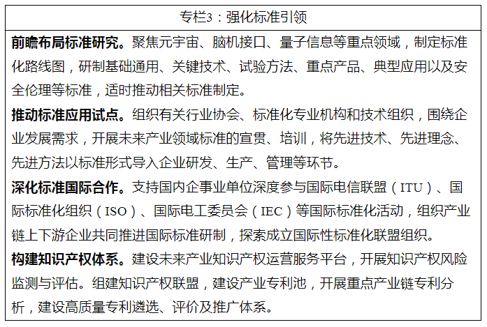 13.加强标准引领与专利护航。结合未来产业发展需求,统筹布局未来产业标准化发展路线,加快重点标准研制。针对重点标准适时开展宣贯和培训,引导企业对标达标,加速未来产业标准应用推广。促进标准、专利与技术协同发展,引导企业将自主知识产权与技术标准相融合。完善关键领域自主知识产权建设及储备机制,深化国际国内知识产权组织协作,构建未来产业高质量专利遴选、评价及推广体系。